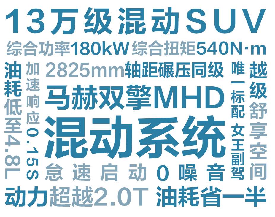 马赫双擎MHD混动系统,由1.5T四缸混动专用发动机和HD120混动电驱总成组成,以包括驻车发电、纯电驱动、串联驱动、并联驱动、发动机直驱以及能量回收6大能量管理模式,覆盖全速域,并在动力加速性、油耗和静音性等方面达到了极佳的平衡。