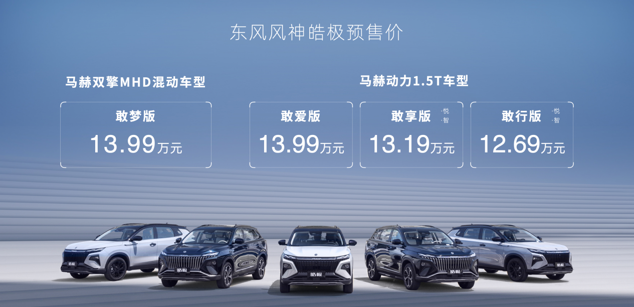 6月18日,风头正劲的东风风神皓极正式开启预售,共推出以马赫双擎·敢梦版(双擎混动)领衔的6个版本车型,预售价格12.69 -13.99万元。