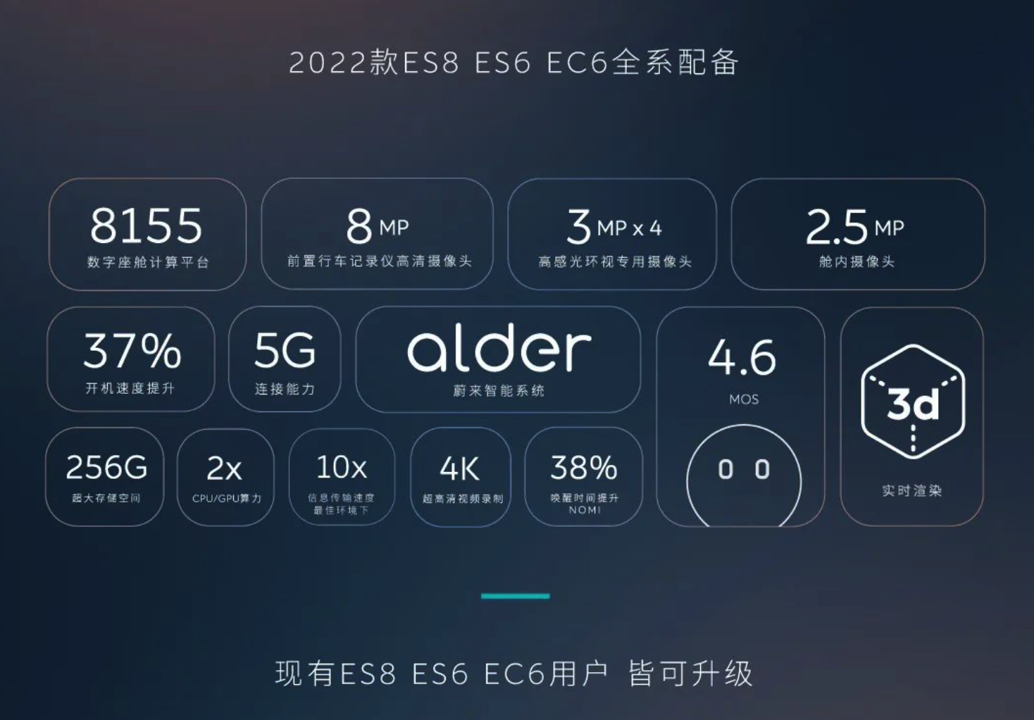 高一级的Alder赤杨平台,也就是这次2022款ES8、ES6、EC6使用的平台,主要升级在于以骁龙8155为驱动的第二代座舱平台和5G网关,可实现车机开机速度提升37%、NOMI冷启动唤醒提升38%、支持5G通讯,信息传输速度相比4G提升10倍,另外还包括配备4颗300万像素摄像头、1台800万像素行车记录仪,以及带红外功能的250万像素舱内摄像头。