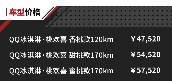 QQ冰淇淋桃欢喜版搭载一台20千瓦(27马力)的驱动电机,根据版本分别配备9.6kWh和13.9kWh的磷酸铁锂电池组,对应的NEDC续航里程为120km和170km。