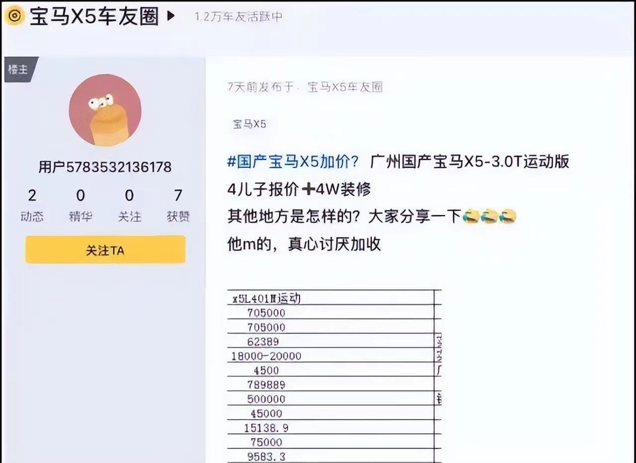 另外,从国产宝马X5的车友圈发现,除了盲目订车的用户需要额外加价,直接去4S店现车下单也要加价,根据不同配置加价幅度在3-5万元不等。当然,部分地区相对会友好一些,并非直接现金加价,而是加装套餐,价格也是2-4万元之间,套餐包括6年6次小保养、车衣、脚垫等。