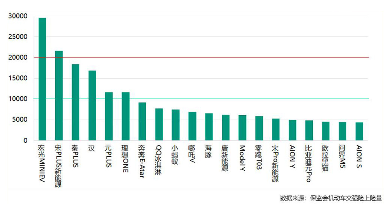 不得不相信~5月内最受欢迎的依然是五菱宏光MINIEV,在微型轿车市场妥妥是最强王者,超2.5万的上险量也直接与排在第二的比亚迪宋PLUS新能源拉开较大的差距。