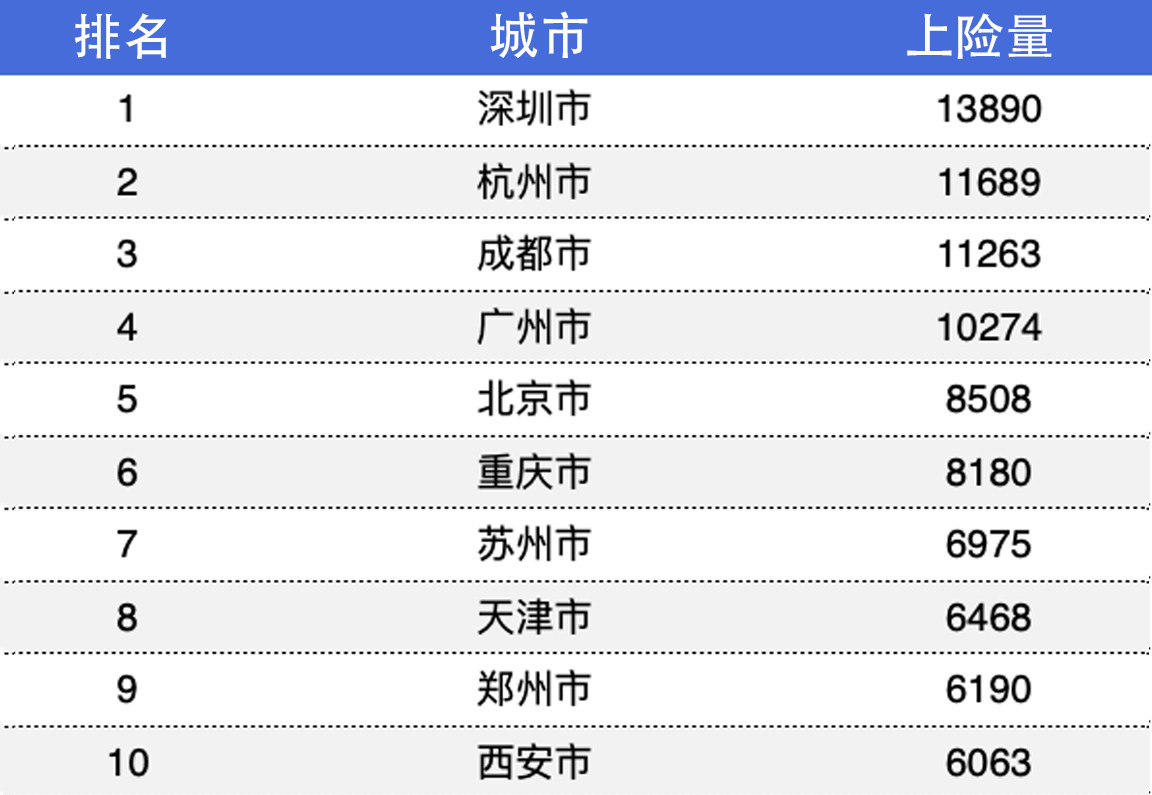 由于地理特性的原因,新能源汽车上险量最多的城市还是归南方城市莫属,深圳以2,000多辆的差距挤进了第一的首位,看来深圳的老百姓对于新能源车型接受度还是蛮高的。
