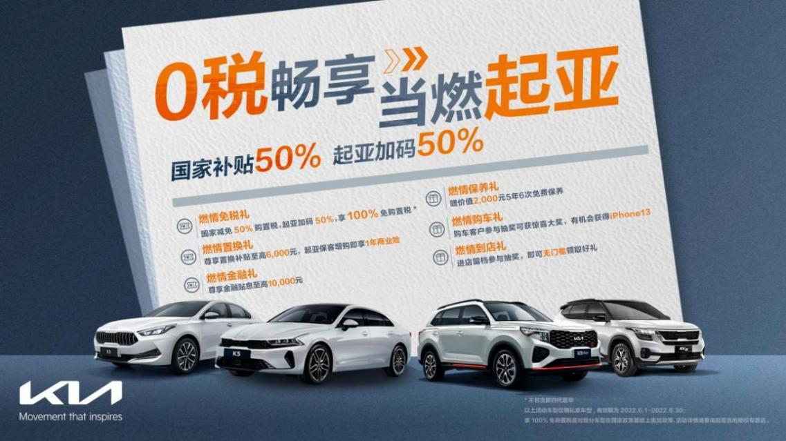 值得关注的是,财政部、税务总局发布了《关于减征部分乘用车车辆购置税的公告》,促进汽车消费,积极响应国家政策,6月2日,起亚加推了“0税畅享 当燃起亚”购车尊享礼遇。即日起至6月30日,购买起亚K5、智跑Ace、K3、傲跑等主销车型,即可享受包含全额购置税补贴,此外还享受至高10,000元金融贴息、至高6,000元的置换补贴、价值2,000元5年6次免费保养、1年商业险、赢取iPhone13等惊喜礼品在内的六重燃情好礼,让用户购车用车养车更轻松,收获不止加一倍的幸福感。
