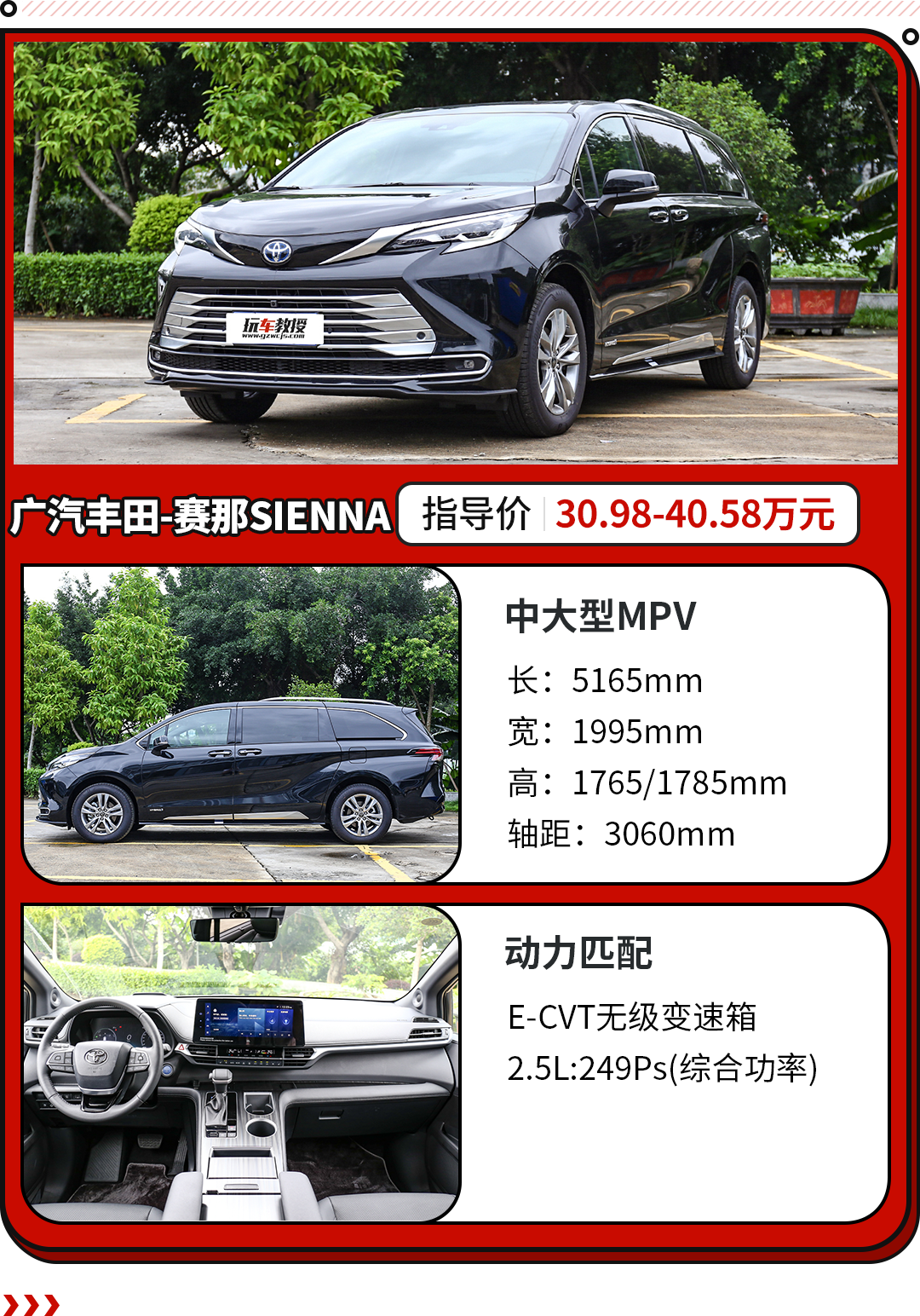 当然,如果你很喜欢丰田赛那但又囊中羞涩,其实完全可以选择入门版车型,配置并不简陋,标配9安全气囊、L2级别驾驶辅助、倒车影像、全速域自适应巡航、电动天窗、双侧电动滑门、远程启动、主驾驶电动座椅、二排独立座椅、后排小桌板、CarPaly和CarLife手机互联、自适应远近灯、后排空调独立出风口以及车内PM2.5过滤装置等配置。