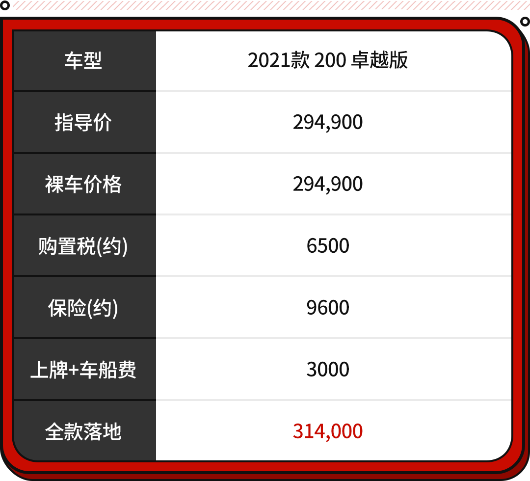 落地价方面,卓越版车型指导价为29.49万元,暂无优惠,购置税6500元,商业保险+交强险9600元,上牌费+车船使用费3000元,全款落地31.4万元。这是没有任何加装装饰和延保的售价,不过一般销售都会建议用户购买延保(费用1.5万元),其作用是将四年或10万公里提升至8年或20万公里,这也并不算是加价,如果有需要的话就很值。