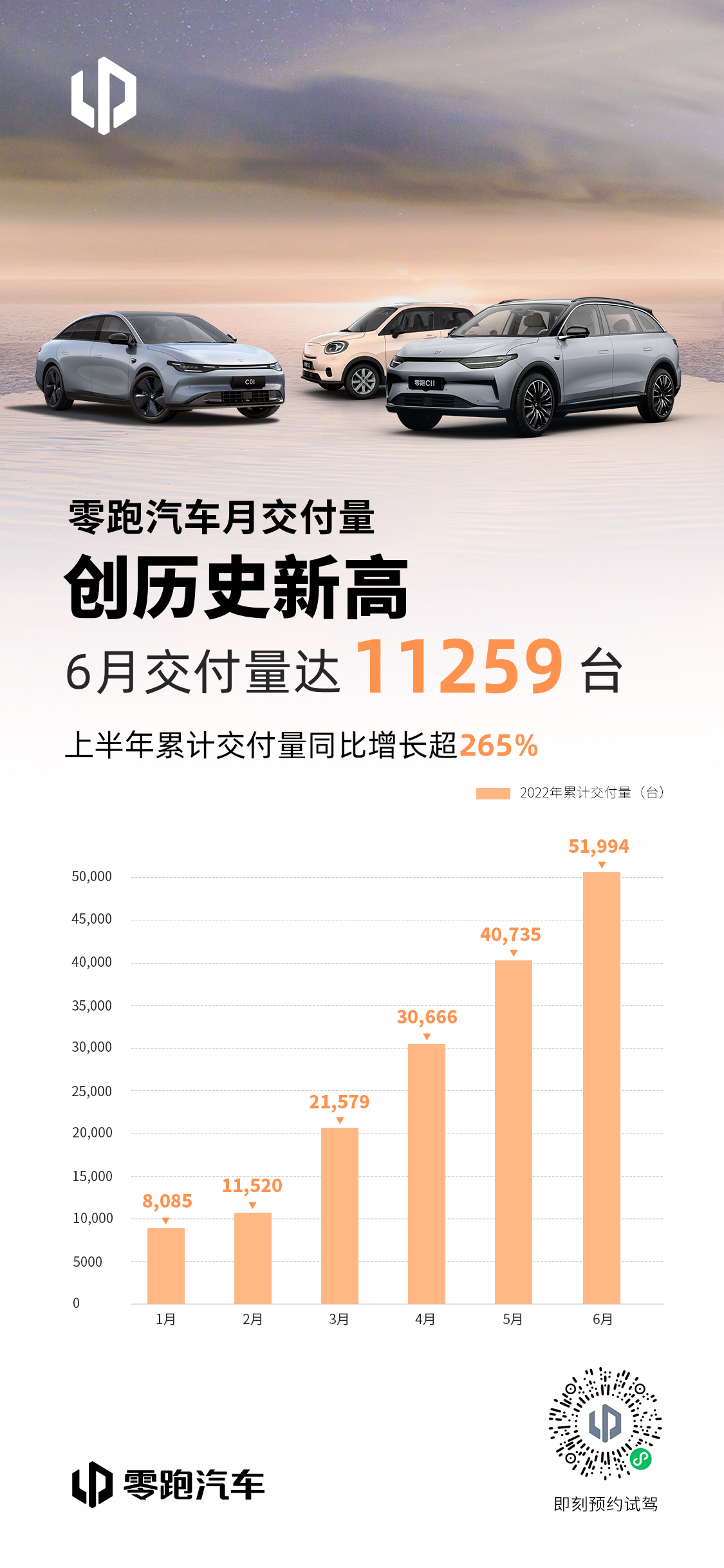 【2022年7月1日,杭州】今日,零跑汽车正式发布2022年6月交付数据,当月共计交付11259台,创历史新高,上半年累计交付量同比增长超265%,站稳造车新势力第一阵营。