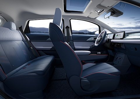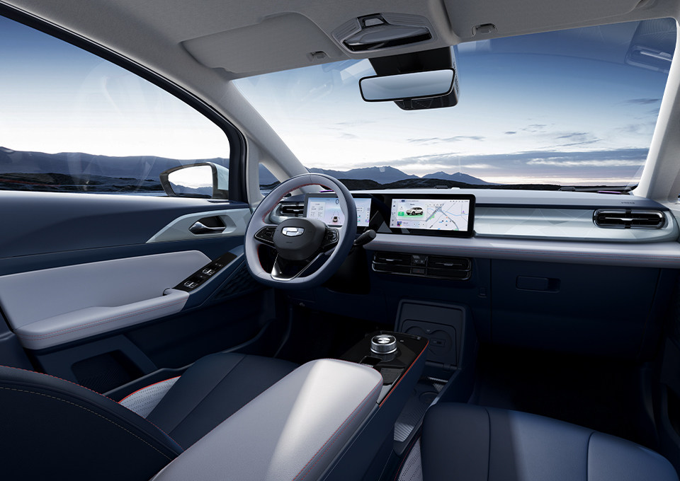 几何E并没有延续几何A还有几何C家族式的座舱设计理念,中控采用了双10.25英寸的双联屏组合。整个内饰座舱也把实体操作按键最简化,且换挡按键也采用精致的旋钮式操作。细节之处融入车身同色的亮色系饰件覆盖,进一步强调了年轻科技的驾乘氛围感。