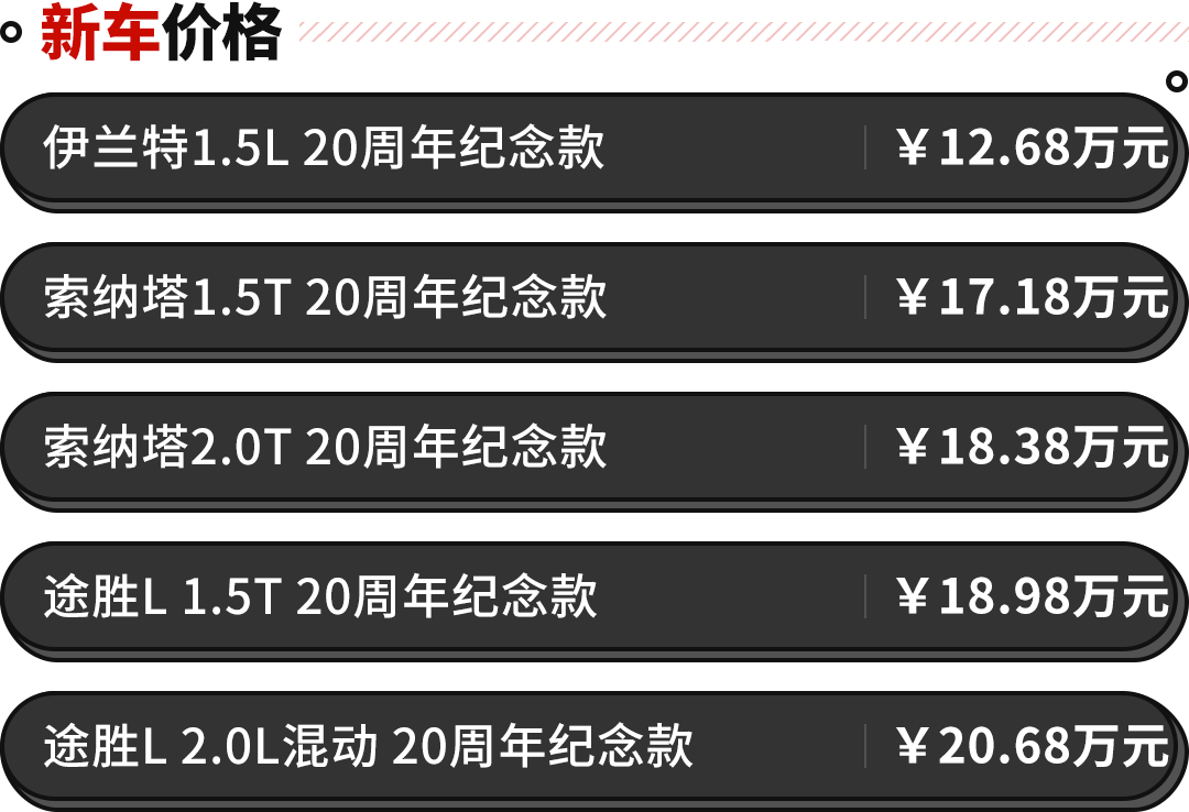 日前,从北京现代官方获悉,北京现代旗下伊兰特、索纳塔和途胜L三款车推出20周年纪念版车型。本次共推出5款车型,其中包括一款伊兰特(1.5L)、两款索纳塔(1.5T和2.0T)以及途胜L(1.5T和2.0L混动),售价区间为12.68-20.68万元。