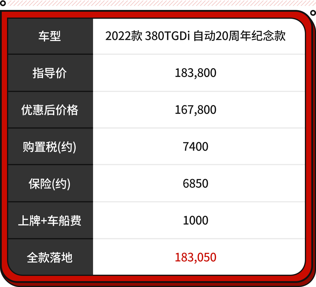 索纳塔2.0T 20周年纪念版车型指导价为18.38万元,与2.0T最低配智享版保持一致,主要变化是新增全速域自适应巡航这一项配置,同时提供可开启全景天窗、方向盘加热以及前后排座椅加热等选装,也更为划算一些。