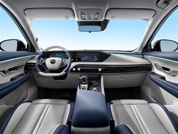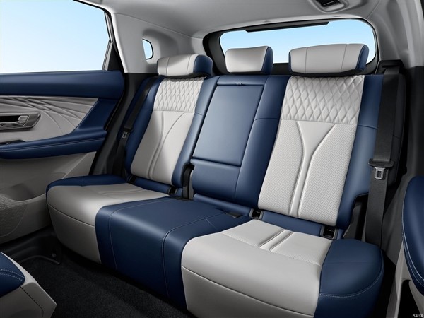 内饰设计也相当有创新风格,能很好与前中控台融为一体的双联屏就很是吸睛。同时,搭配上触摸式中控按键的多功能方向盘以及样式精致的电子档杆,也是增添了不少科技视觉。最值得一提的是,其有一种蓝白撞色配色方案也使得整套内饰极显高级感。
