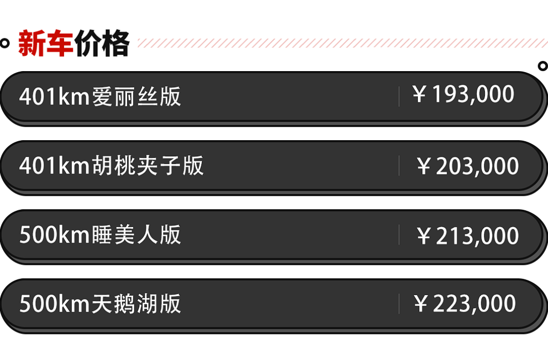 根据续航能力和配置的不同,新车一共拥有了401km和500km两种续航版本共四款车型,并且根据不同车型推出了两个不同的选装包。其中,新车的售价区间为19.3万-22.3万元,适用于爱丽丝版和睡美人版的暖心闺蜜选装包价格为12000元,适用于胡桃夹子版和天鹅湖版车型的安全舒适选装包价格为4000元。
