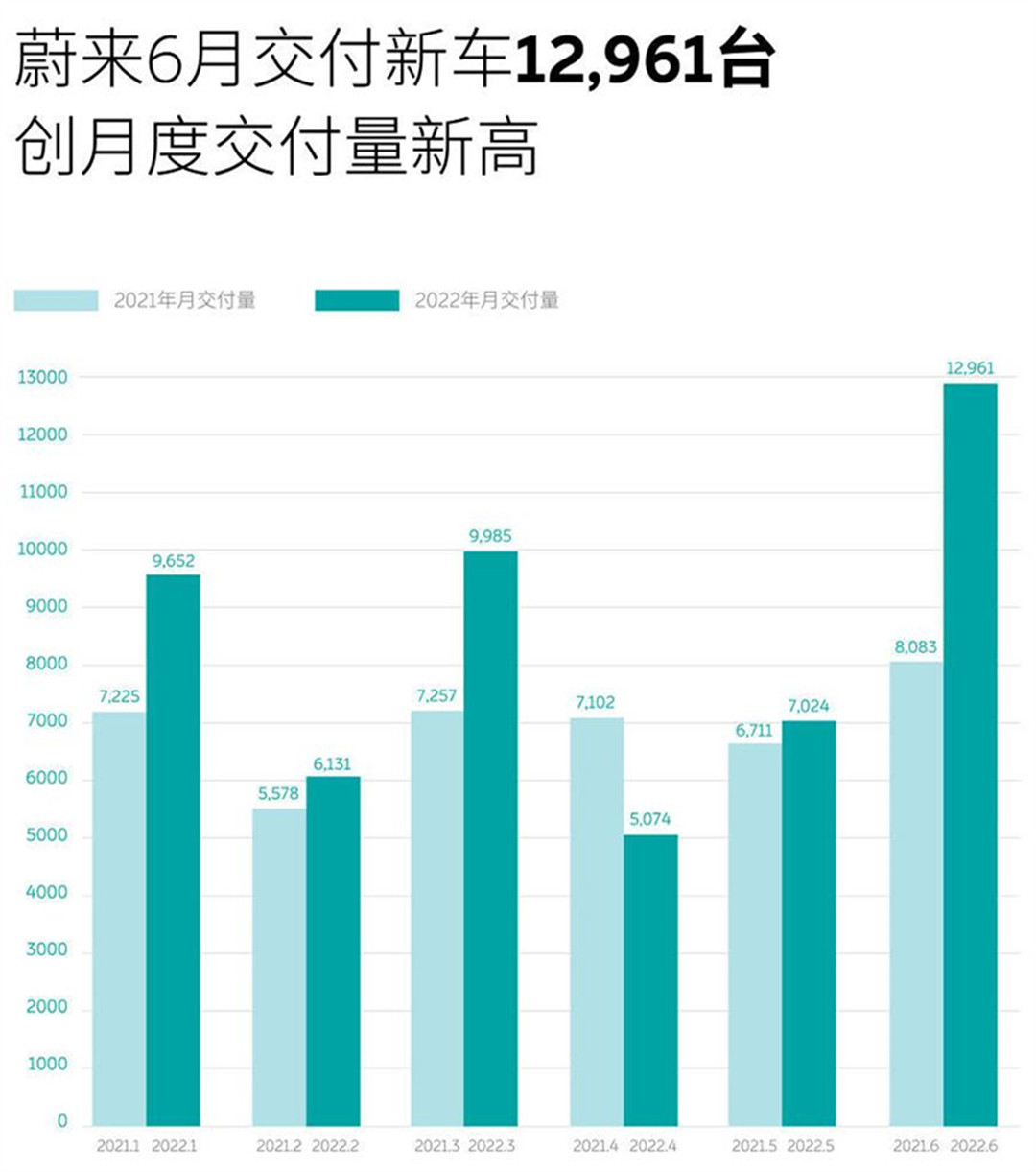 目前蔚来的供应链和整车生产已全面恢复,在6月份终于有过万的交付量,达到了12961辆,同比增长了60.3%。