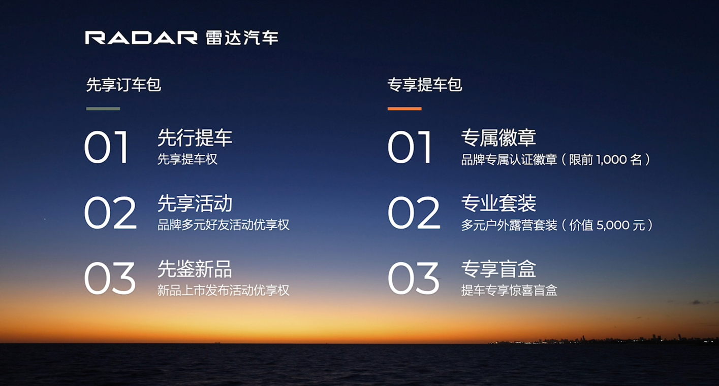 准车主福利进行时!雷达RD6将于今年上市,现在“0元预定”通道已开启。首批预订用户,可享受优先提车权、品牌多元好友活动优享权、新品上市发布活动优享权等先享订车礼包,还可获得雷达汽车官方App品牌专属认证徽章、惊喜盲盒、价值 5000 元的多元户外露营装备等专享提车礼包。即刻,开启多元户外精彩生活。