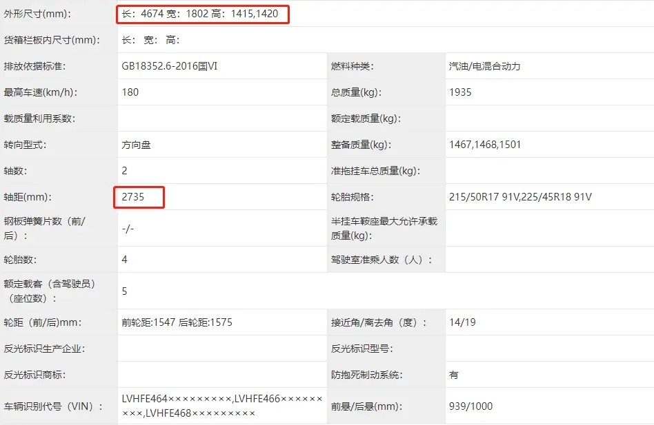 思域混动版(e:HEV)长宽高分别为4674/1802/1415、1420mm,轴距2735mm,与燃油版车型也同为一致。