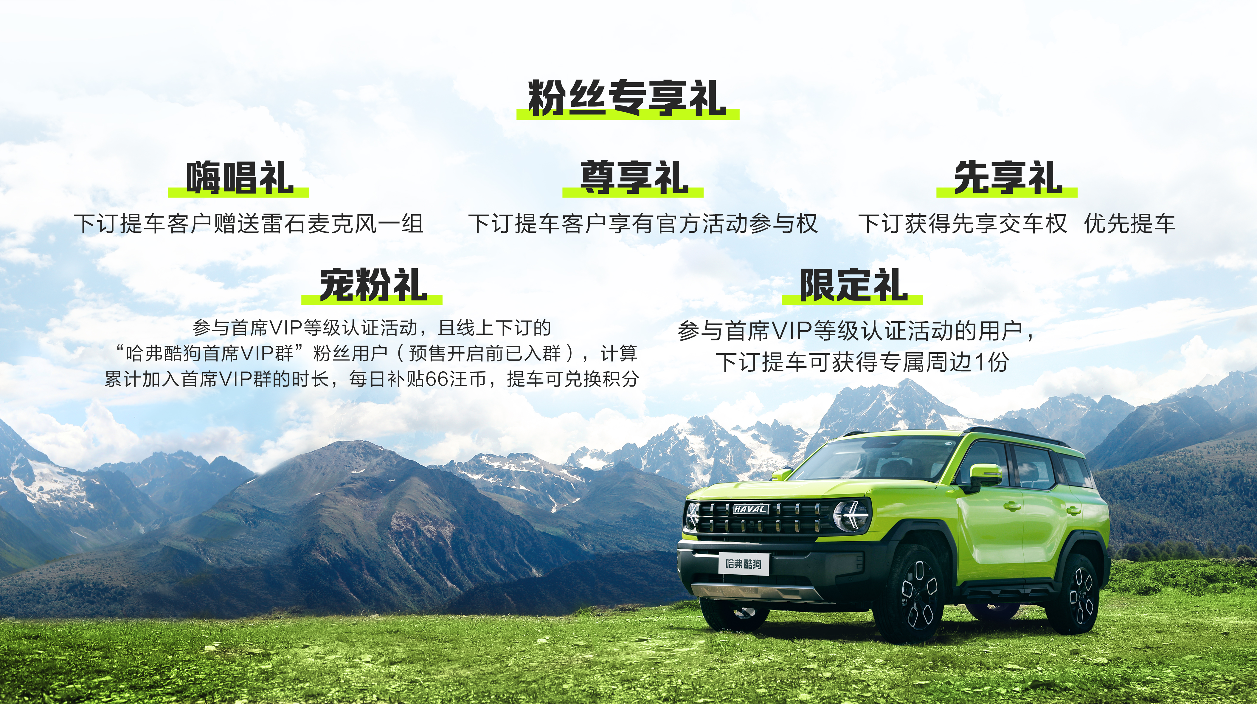 在九重重磅好礼之外,所有参与过哈弗酷狗车型共创活动的共创官们还可额外享受五重专享好礼——嗨唱礼、尊享礼、先享礼、宠粉礼、限定礼,参与直播间线上互动,跟随哈弗酷狗一起沉浸于曼妙乐音中,共同抵达心中热爱的远方。