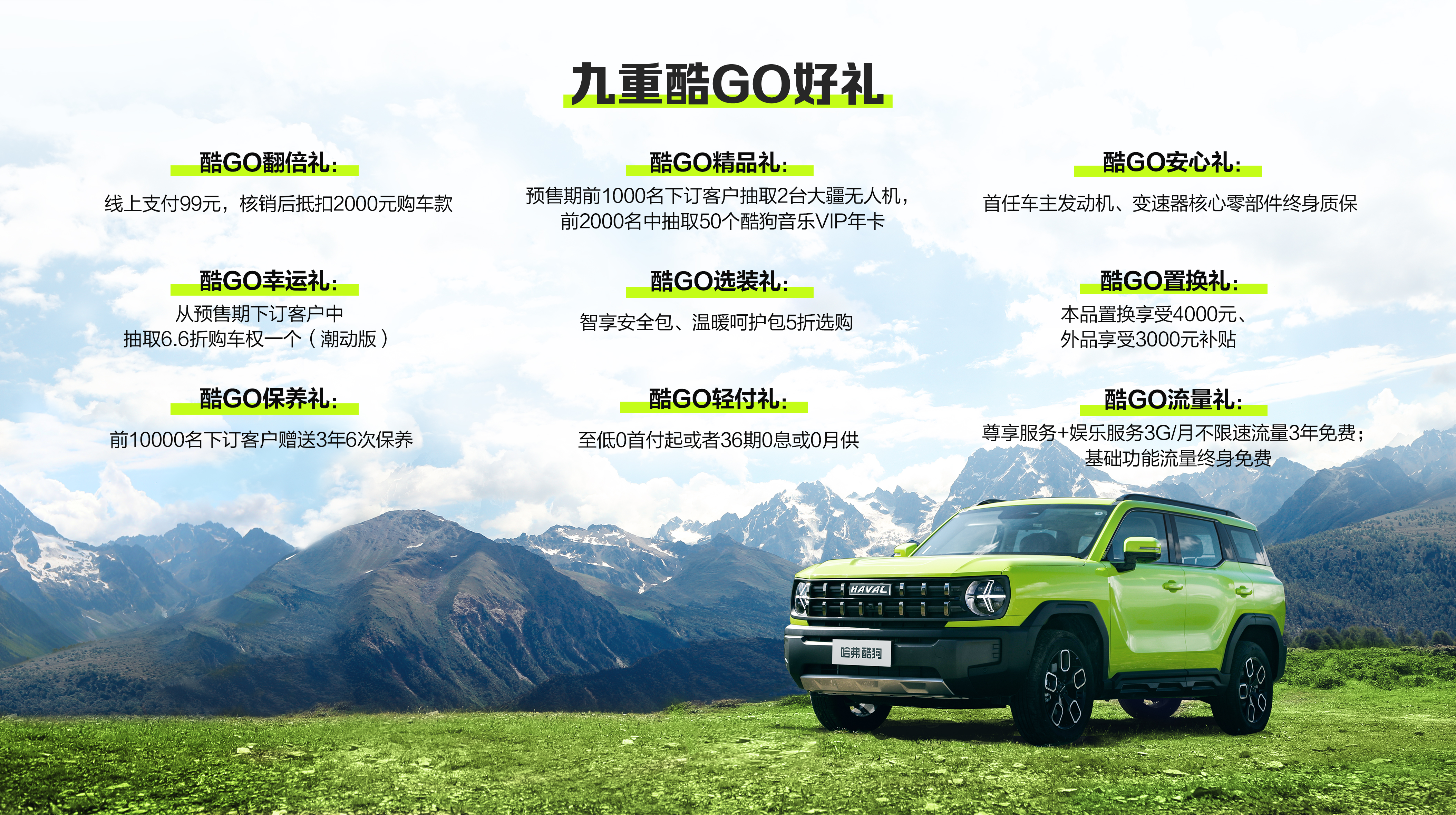 预售期间,哈弗酷狗为敢性青年们带来了下单即享的【九重酷GO好礼】,购车优惠、折扣权益、保养福利等多重权益应有尽有,让年轻人与远方之间的距离变得更加触手可及。