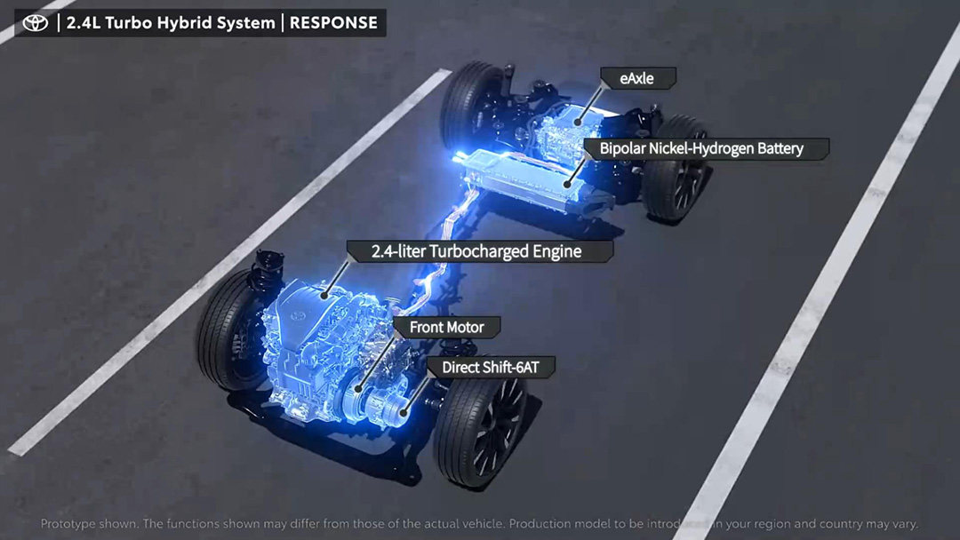 这套全新的混动系统由2.4T涡轮增压发动机、前轴电机、Direct Shift-6AT手自一体变速箱、采用高输出功率电机的后桥eAxle以及一组双极镍氢电池组成。
