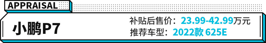动力方面,小鹏P7车型较多,今天推荐的2022款 625E车型,电动机最大功率196kW,最大扭矩390N·m,电池容量为77.9kWh,CLTC纯电续航里程为625km, 快充状态下,在33min内便可充至80%电量。这样动力水平、续航能力以及使用便利性,还是比较不错的。