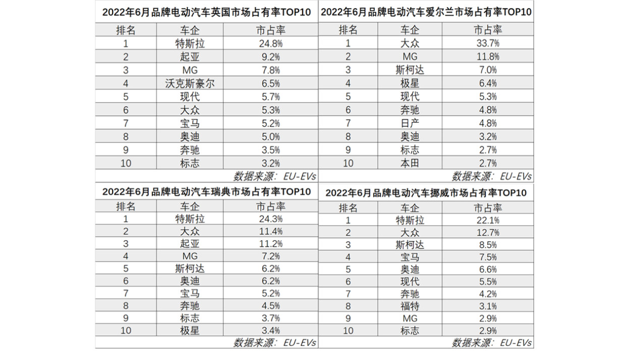 近日,EU-EVs公开欧洲多国6月纯电销量数据,上汽乘用车旗下MG品牌再创新高,以爱尔兰第2、英国第3、瑞典第4、挪威第9等成绩进入欧洲多国纯电市场前十,并成为上述国家纯电市场前十中唯一中国汽车品牌。MG品牌正在以破竹之势,不断刷新中国汽车品牌在欧洲高能级市场的成绩。