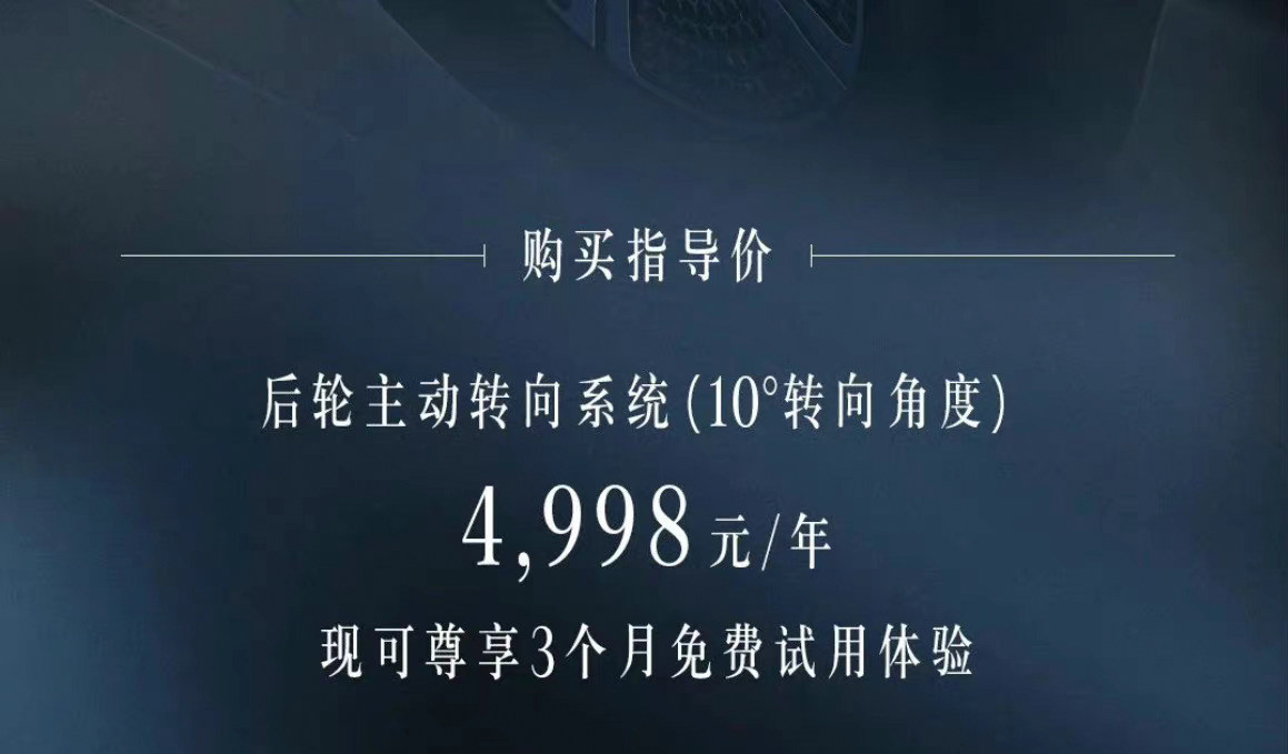 这个需要付费订阅享用的后轮转向系统,出现在了奔驰EQS 450+先锋版车型上(入门版本),车型基础配置同样提供后轮转向功能,而且是标配。但标配的后轮转向的最大转向角度只有4.5°,如果要升级到10°的最大后轮转向角度,需要另外加付4999元/年的订阅费。