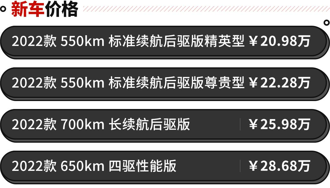 动力方面,新车分别提供后驱以及四驱两种驱动形式可选,其中标准续航后驱车型则配备的是一台最大功率为150kW,峰值扭矩为310N·m的驱动电机,最大续航里程为550km;长续航版本最大功率为230kW,峰值扭矩为360N·m,最大续航可达700km;四驱车型最大功率为390kW,峰值扭矩为670N·m,最大续航可达650km,百公里加速仅为3.8s。