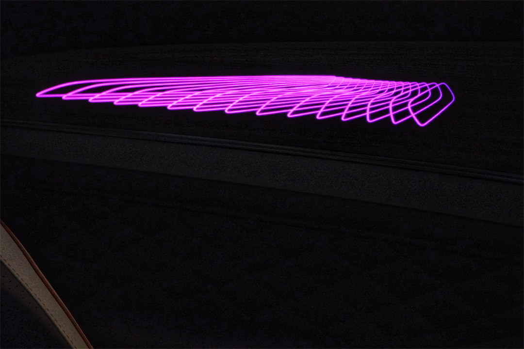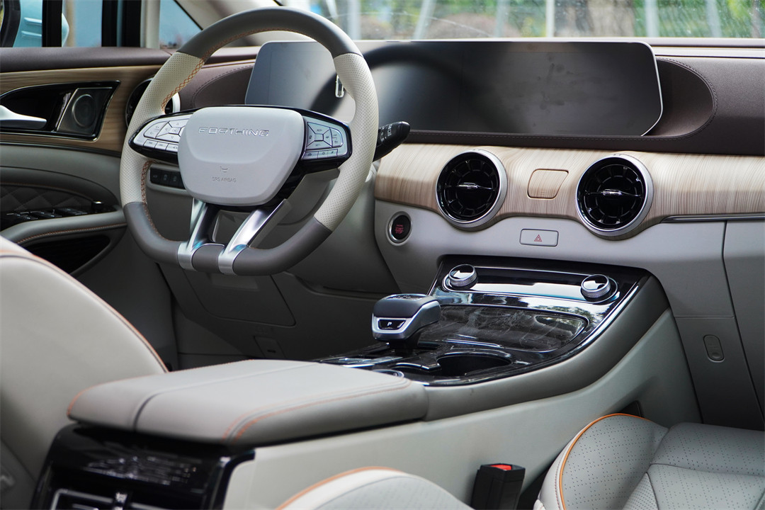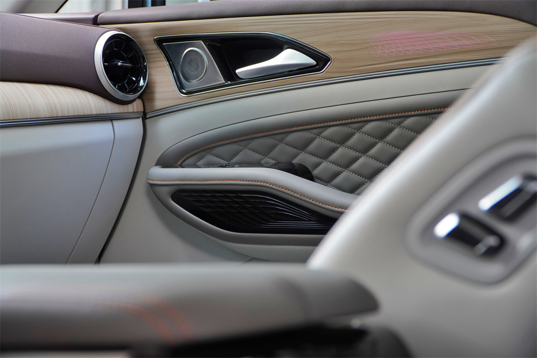 车内环抱式的座舱搭配了木纹饰板,镶嵌在里面的氛围灯还会随音乐节奏闪动,整套内饰分成了几层不同的材质进行搭配,确实能营造出游艇的氛围。