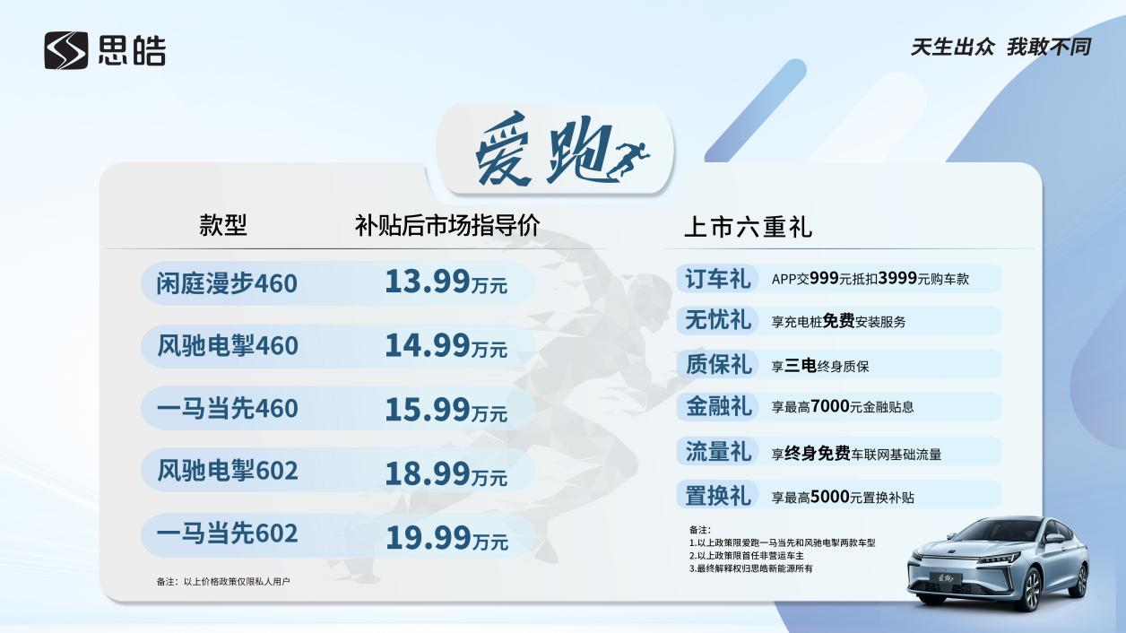 7月28日,伴随着一场真人秀户外沉浸式体验直播,智炫纯电轿跑——思皓爱跑正式上市,共推出5款配置,售价13.99-19.99万元。新一代蜂窝电池、602km长续航、华为智能生态、大美掀背造型、7秒级零百加速、智感热泵空调2.0,思皓爱跑将重新树立15万元级智能纯电家轿市场价值标杆。即刻下订立享价值16666元的六重新车礼包,惊喜连连。