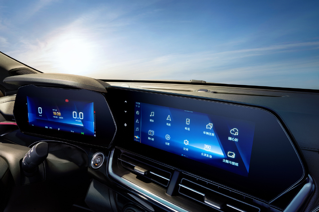 两块液晶屏幕的折叠角度面向主驾驶座舱,屏幕组合分别由两块10/25英寸的仪表和触控屏幕折叠组合而成。其车机系统内置全新小雪OS智能车联系统,并配备安吉星系统。带有OAT升级和无线CarPlay等功能。