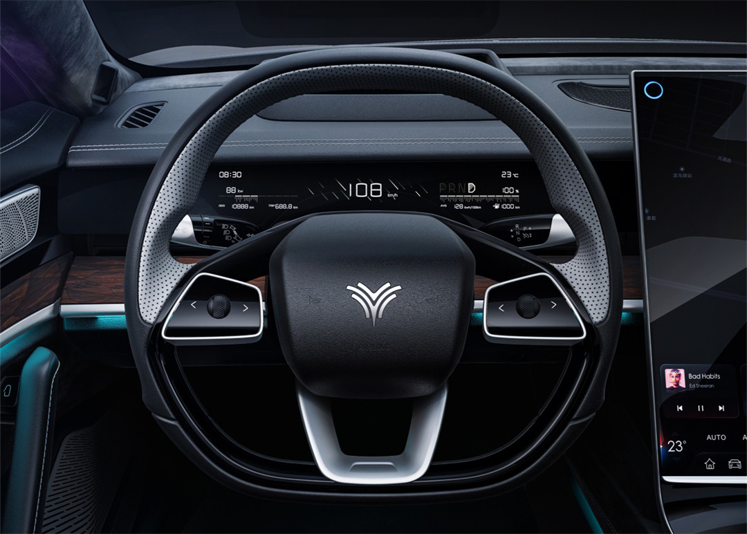 车机搭载了高通骁龙8155芯片,并拥有QNX实时操作系统和Hypervisor虚拟化技术。多功能方向盘以镂空为设计理念,带来了悬浮的观感。