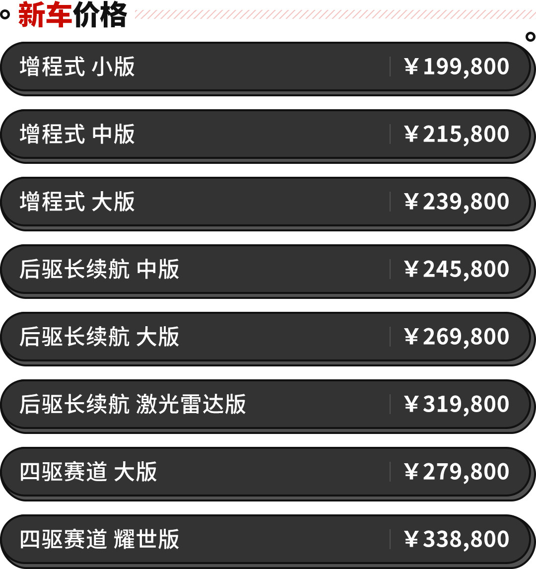 新车的售价区间为19.98-33.88万元,分为增程、后驱长续航、四驱版3种,相比此前预售拥有剪刀门设计的耀世版要便宜不少,将于第四季度启动交付,具体如下: