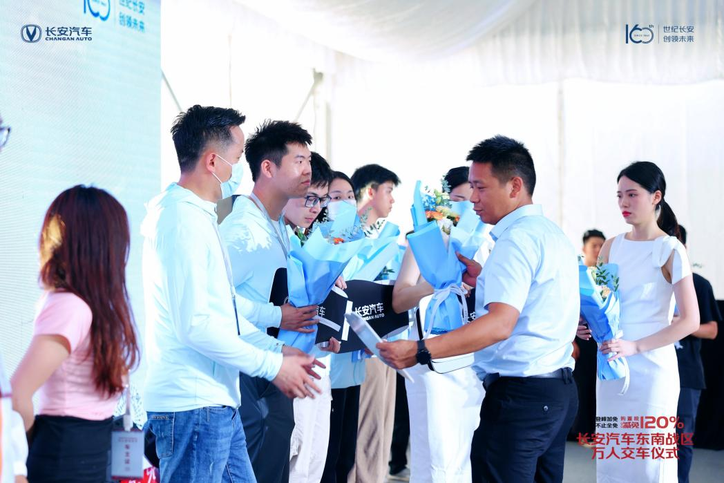 在万众瞩目下,新车交付环节正式开启。新车主们从长安汽车领导手中接过新车钥匙和专属交车礼,脸上都洋溢着愉快的笑容,长安汽车领导与车主们一起分享着喜悦,推动现场气氛达到高潮。