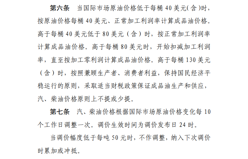 首先,当本次调价的前十个工作日内平均价格与上次调价的十个工作日平均价格相比,调价金额高于50元/吨时,零售价格才作调整。当调价金额不足50元/吨时,零售价格则不做调整,而是将未调金额纳入下次调价时累加或冲抵。