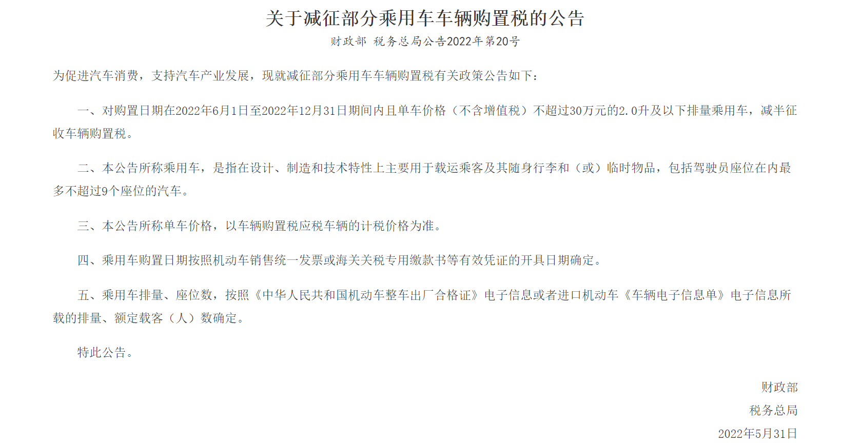 为了挽回传统燃油车销量下滑的颓势,公告规定,对购置日期在2022年6月1日至2022年12月31日期间内且单车价格(不含增值税)不超过30万元的2.0升及以下排量乘用车,减半征收车辆购置税。