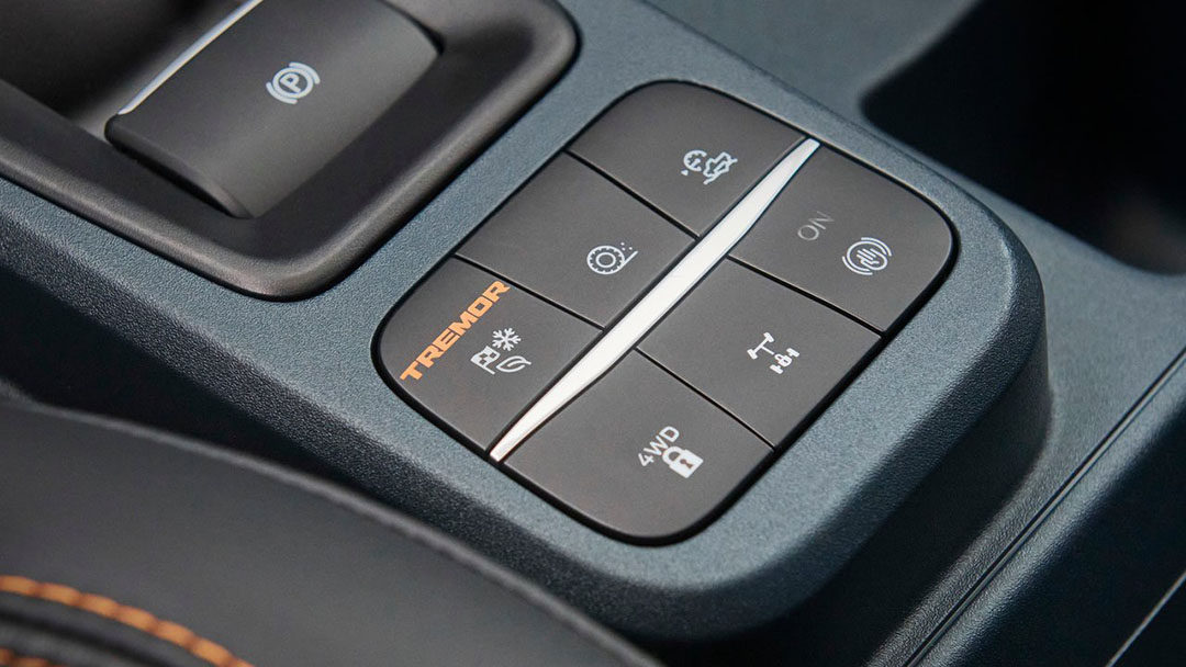 可以看出新车整个底盘都进行了专注于越野方面的性能升级,而且加上新车升级了智能驾驶辅助系统——福特Maverick Tremor独有的越野巡航控制系统(Trail Control),可以自动控制油门和刹车,使得车辆本身能在复杂地方,例如全是泥土的非铺装道路上,能让车辆按照设定的速度,不断调整驱动轮的牵引力输出,让驾驶者能以轻松的字条离开人迹罕至的地方,不愧是出家旅行必备良药。