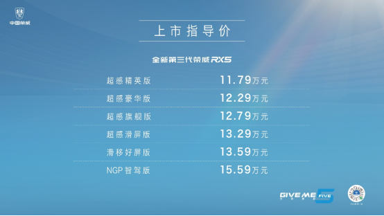 全新第三代荣威RX5共推出6款配置,官方指导价11.79-15.59万元;超混eRX5共推出3款配置,官方指导价15.39-16.59万元。新车提供丝绒银、北极蓝、珠光黑、珠光白、云锦灰5种车身颜色,搭配活力棕、典雅黑两款内饰配色,满足用户个性化需求。