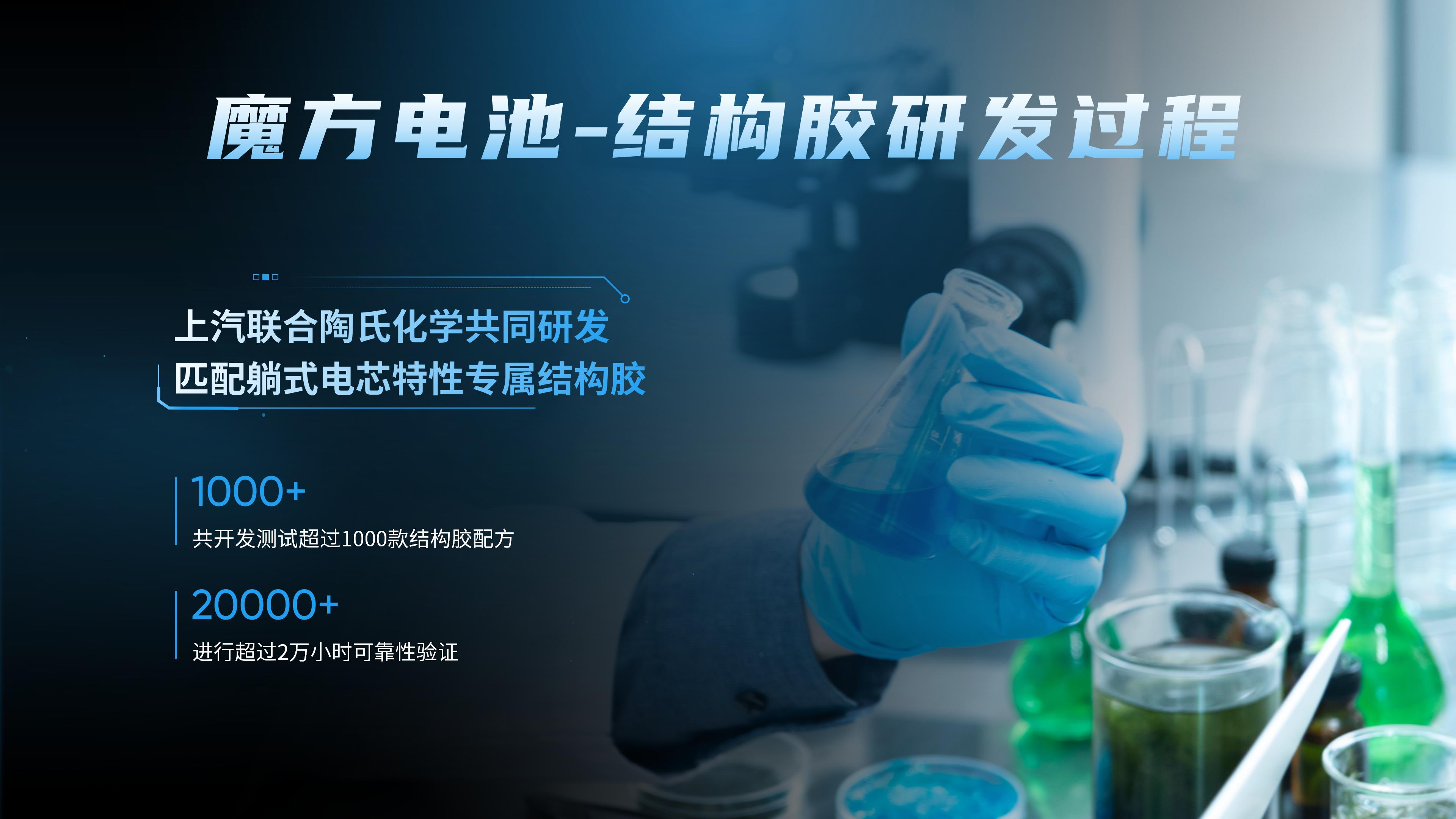 值得一提的是,目前业界对电芯的处理方式都是立式摆放,将电芯“躺式”放置为结构设计开发带来了巨大的难题。因为结构胶会随着电芯膨胀以及压板相应变形,面临苛刻的受力工况,同时需要匹配电芯超长生命周期,这对结构胶性能提出了巨大的挑战。在魔方电池整个开发过程,上汽创新研发总院的工程师联合合作伙伴共同开发测试了千余款结构胶方案,历经两万小时的可靠性验证,最终才确定结构胶配方。