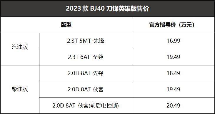 动力方面,新款BJ40刀锋英雄版分别提供2.0T柴油和2.3T汽油两款发动机。其中,柴油版最大功率为120kW,峰值扭矩为380N·m;汽油版最大功率为170kW,峰值扭矩为345N·m。值得一提的是,得益于柴油发动机出色的经济燃油性和75L超大油箱,其一箱油可实现1000公里的超长续航,对于喜欢挑战长途穿越的越野人来说,能够大大的缓解续航带来的焦虑。