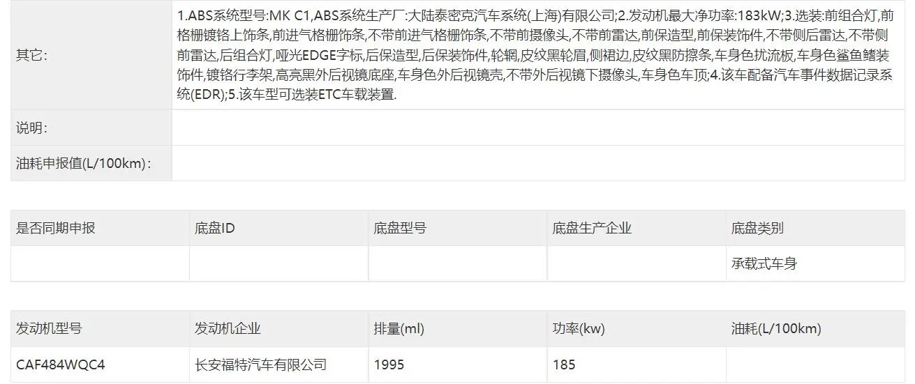 尾部也展现出全新设计语言,特别是尾灯的细节,两侧均采用了多段式的LED灯带,并进行了熏黑处理,跟中间黑色饰条的结合,营造出了贯穿式尾灯的效果。此外,在上方、黑色饰条处都加以福特图形和英文标识,是进一步强化提升整车辨识度。