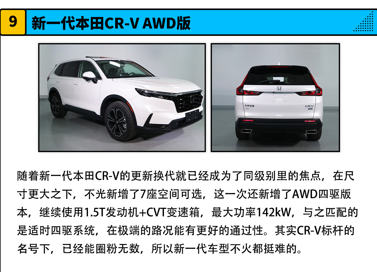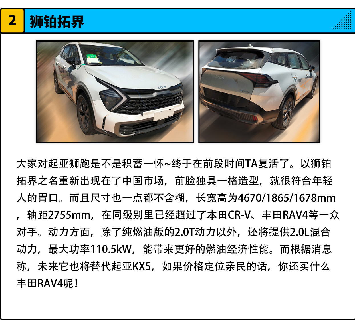 总体来看,此次的申报图能看出来,合资品牌们也开始了集体发力,各种重磅车型层见迭出,像新一代CR-V、新一代皓影、新一代锐界等等,争夺战也再度打响,就为了在下半年里巩固市场的地位。不知各位看官们有没有找到自己心仪的车型呢~