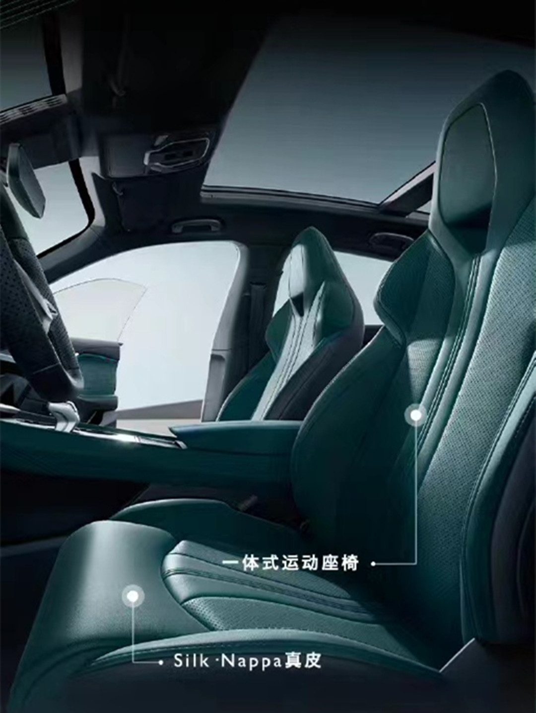 运动座椅采用了一体式头枕的设计,类似于赛车桶椅,且带有麂皮绒和Nappa真皮面料双拼。颜色搭配上提供了赤霞朱红和孔雀森林绿2种可选。