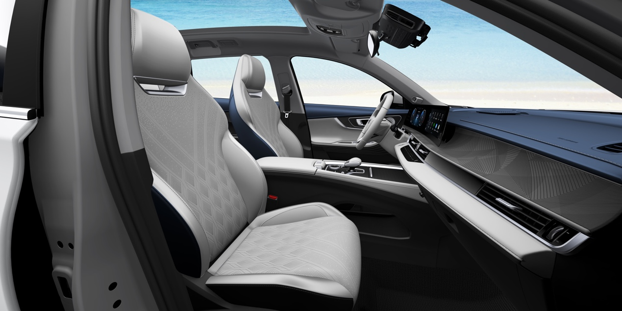 再来看内饰,新车的中控台很明显偏向于驾驶员一侧,显然这种环抱式的座舱设计,更注重驾驶者的感受。蓝灰撞色内饰,带来仿若置身科幻电影中未来座驾的前卫体验。24.6吋寰宇星云沉浸环绕屏配合D字型平底方向盘,瞬间提升了车内的科技感和档次感。