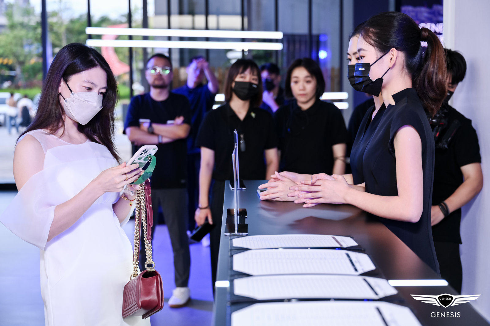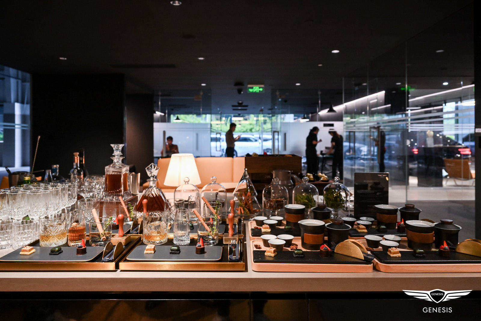 思廊(The Genesis Lounge)在橡木与铜饰面的相互辉映下,让你在温馨而舒适的氛围中享受真挚周全的服务;开放式展厅内由织物隔板划分出的,是专供你享受车辆定制服务的专属区域。