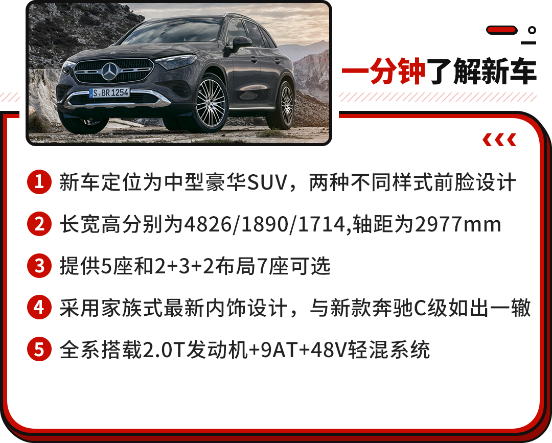 全新一代奔驰GLC不仅在整体设计层面迎来了大幅调整,还配备了两种不同样式的前脸设计,同时轴距加长并增加了7座版车型,以及采用奔驰家族式最新内饰设计,豪华感和科技感提升显著。更重要的是,动力系统有所升级,并全系增加48V轻混系统,实现更好的燃油经济性和平顺性。