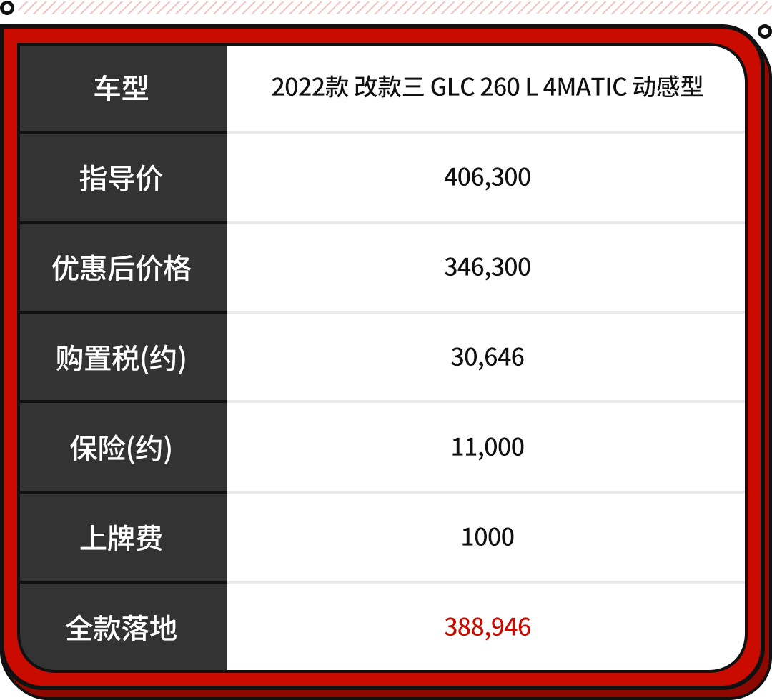 而现款奔驰GLC起售价为40.63万元,预计新一代奔驰GLC起售价会接近42万元。而就算不涨价,在没有优惠的情况下,新一代奔驰GLC入门版落地都要45万元,与现款车型差距非常明显。
