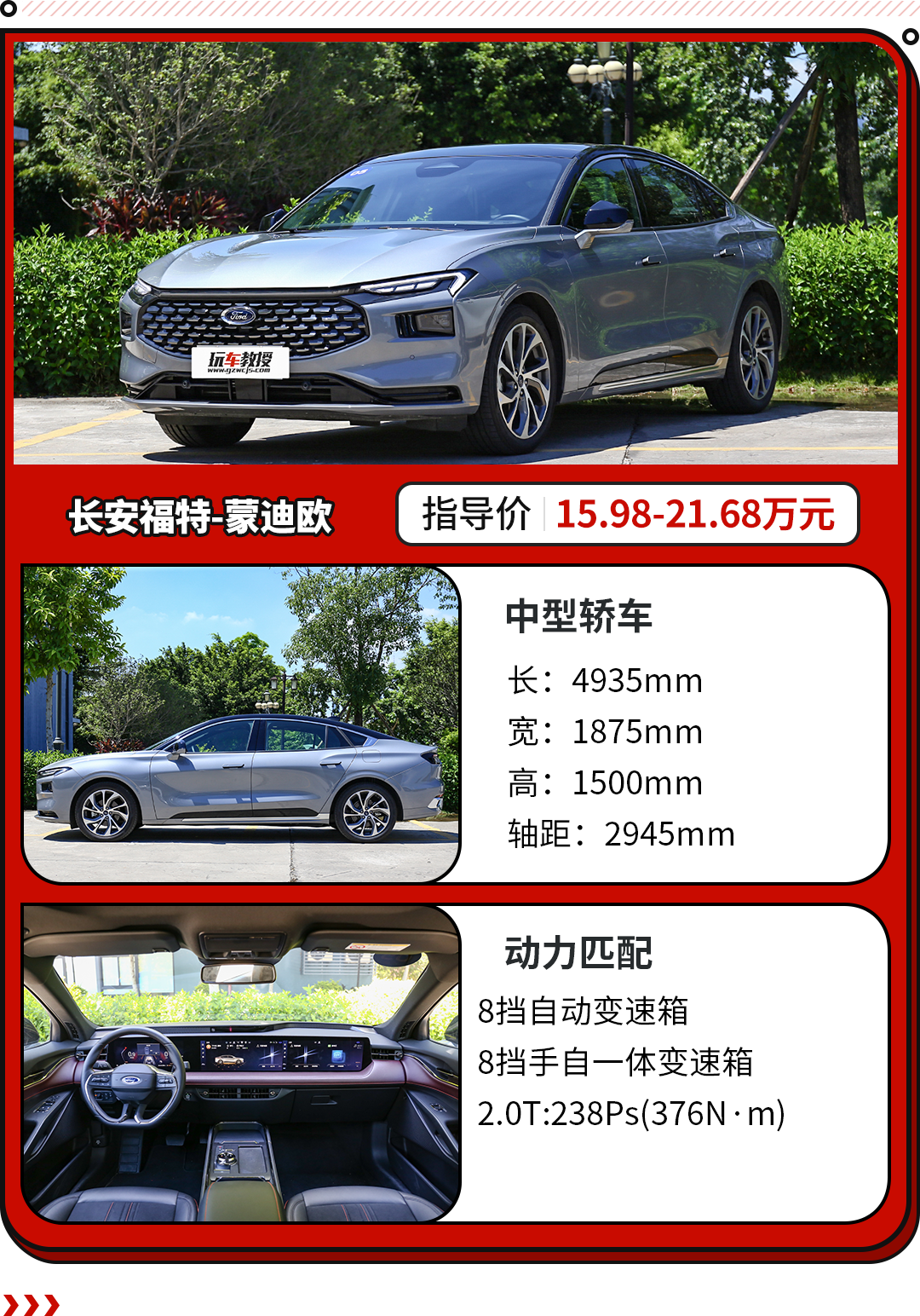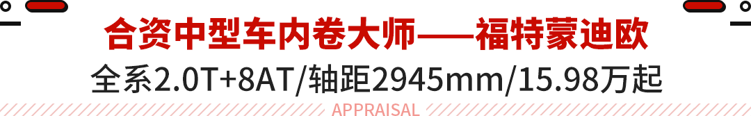 如果说吉利星瑞和长安UNI-V把紧凑级2.0T轿车价格打下来,那么福特新一代蒙迪欧则把合资中型轿车的价格打下来。2022年4月,新一代蒙迪欧正式上市,起售价仅15.98万元,并全系搭载2.0T+8AT黄金动力,同时轴距更是达到了2945mm,加上运动激进的外观设计以及科技感满满的内饰布局,迅速火遍全网。