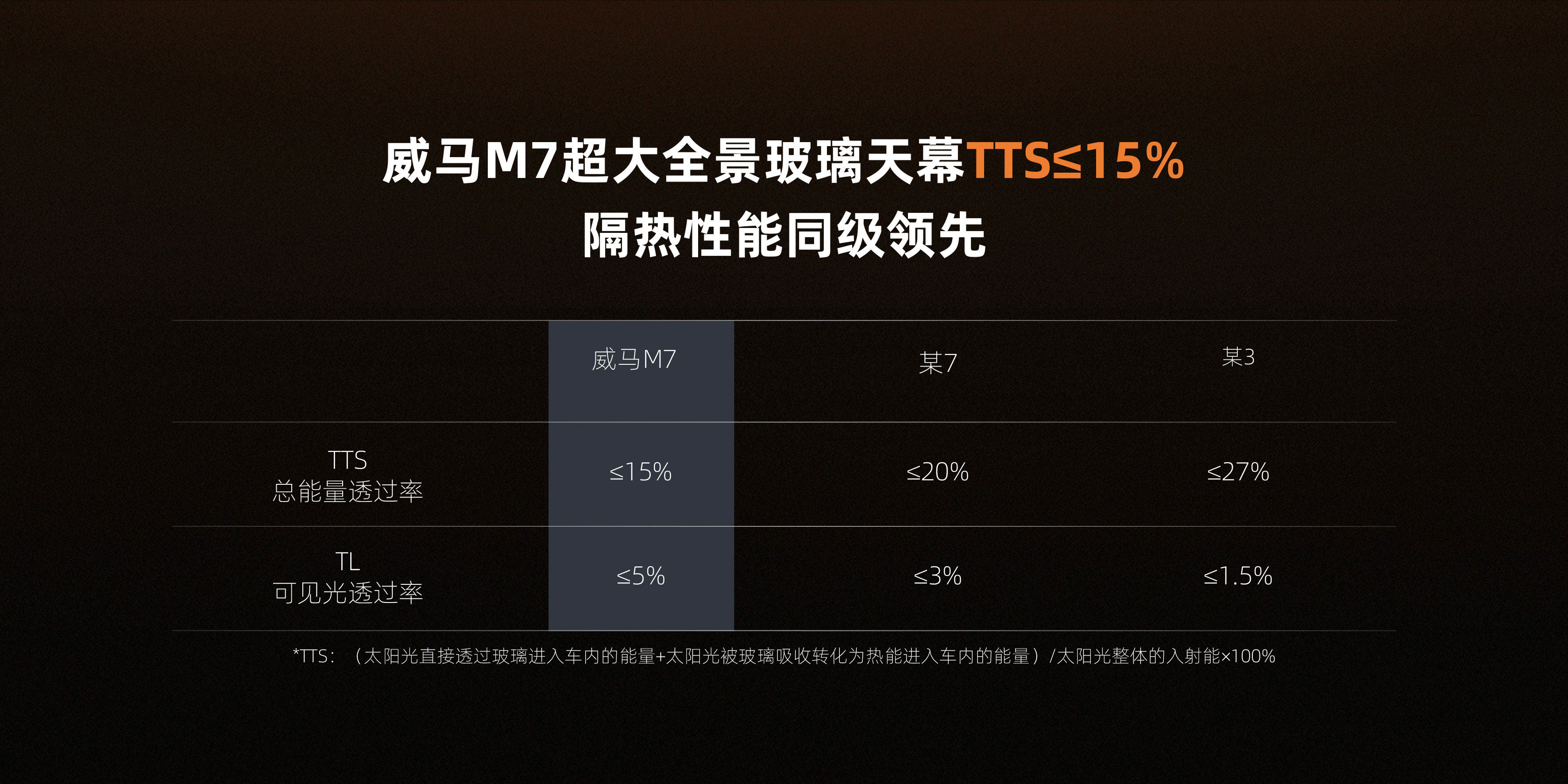 首先就得从物理硬件说起,威马M7所搭载的全景天幕集合有一系列“黑科技”,如有纳米镀银、PVB灰膜、Low-e镀层等三重防晒的隔热玻璃在,这也使得威马M7紫外线阻隔率达到99.99%。什么概念?就是几乎隔热隔晒了。