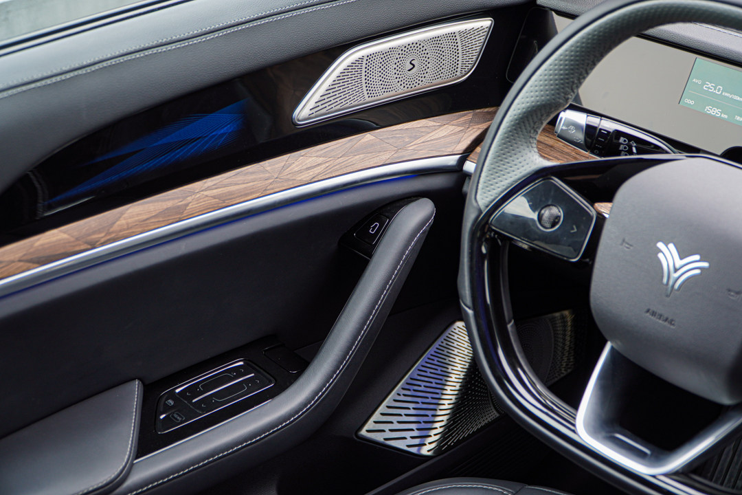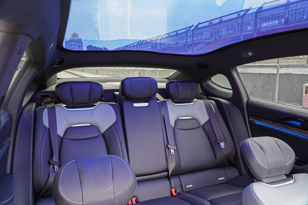 前后的无框车门都使用了双层夹胶的隔音玻璃,在赛道的大直道跑到时速超过160km/h时,对风噪的控制依然到位,且风阻系数也仅有0.216Cd,处于第一梯队的水平。