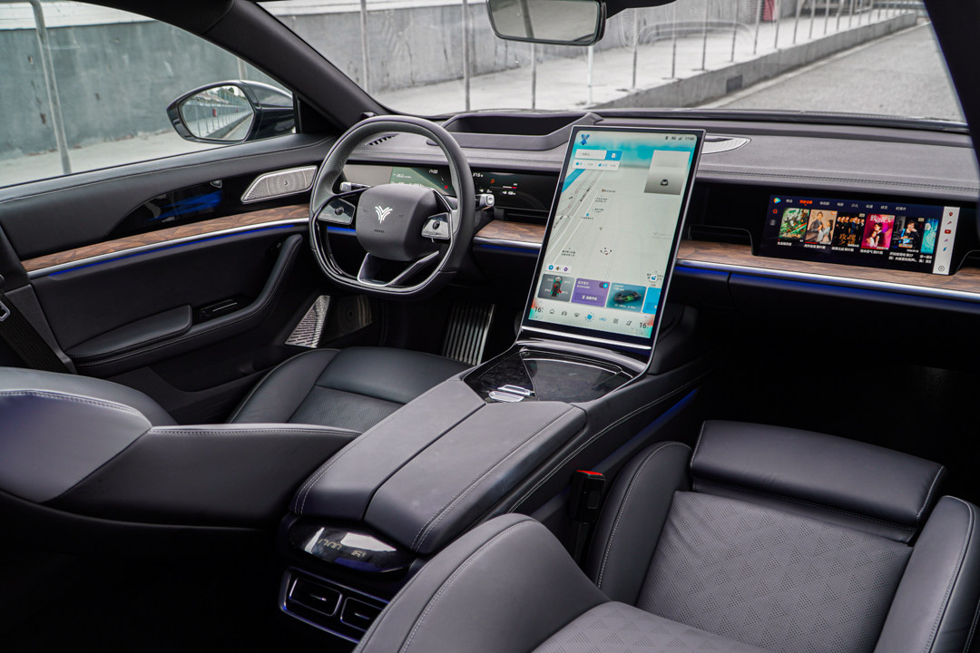 哪吒S内饰最抢眼的就是17.6英寸2K中控屏、12.3英寸副驾驶娱乐屏、AR-HUD以及全液晶仪表共4块屏幕,组成四屏联动的功能,车机搭载的是大家熟悉的高通骁龙8155芯片。