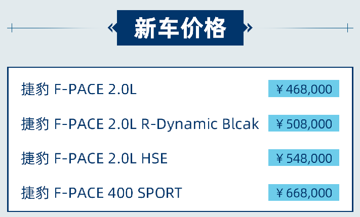 捷豹F-PACE自问世以来就一直与同样是传统豪强阵容的奔驰GLC(40.63-47.68万)、奥迪Q5L(39.68-48.88万)等车型“厮杀”。相比之下,新款捷豹F-PACE在售价以及品牌力层面,是要逊色不少。